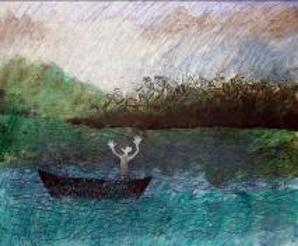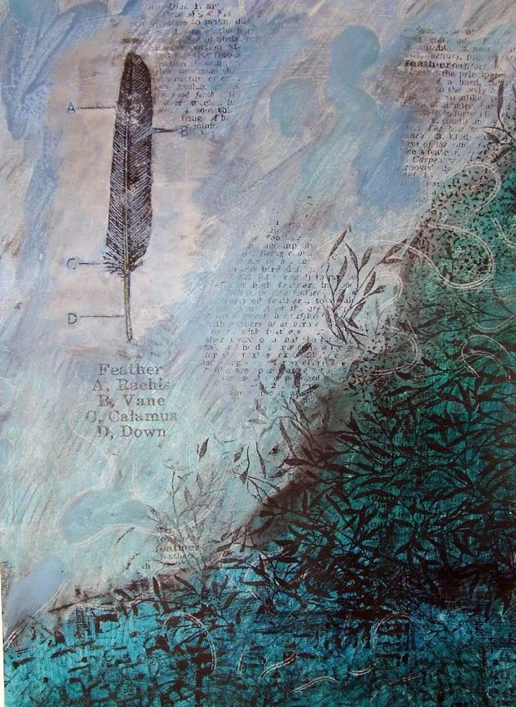 A mixed media off-press mono-print, incorporating textures and hand-painting.